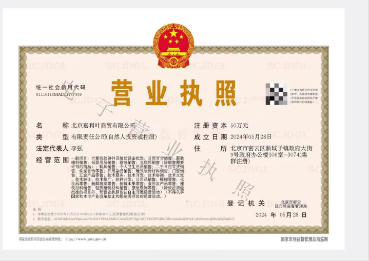 北京嘉利叶商贸有限公司营业执照。受访者供图
