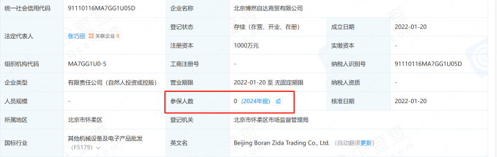 北京博然自达商贸有限公司2024年参保人数为0。企查查截图